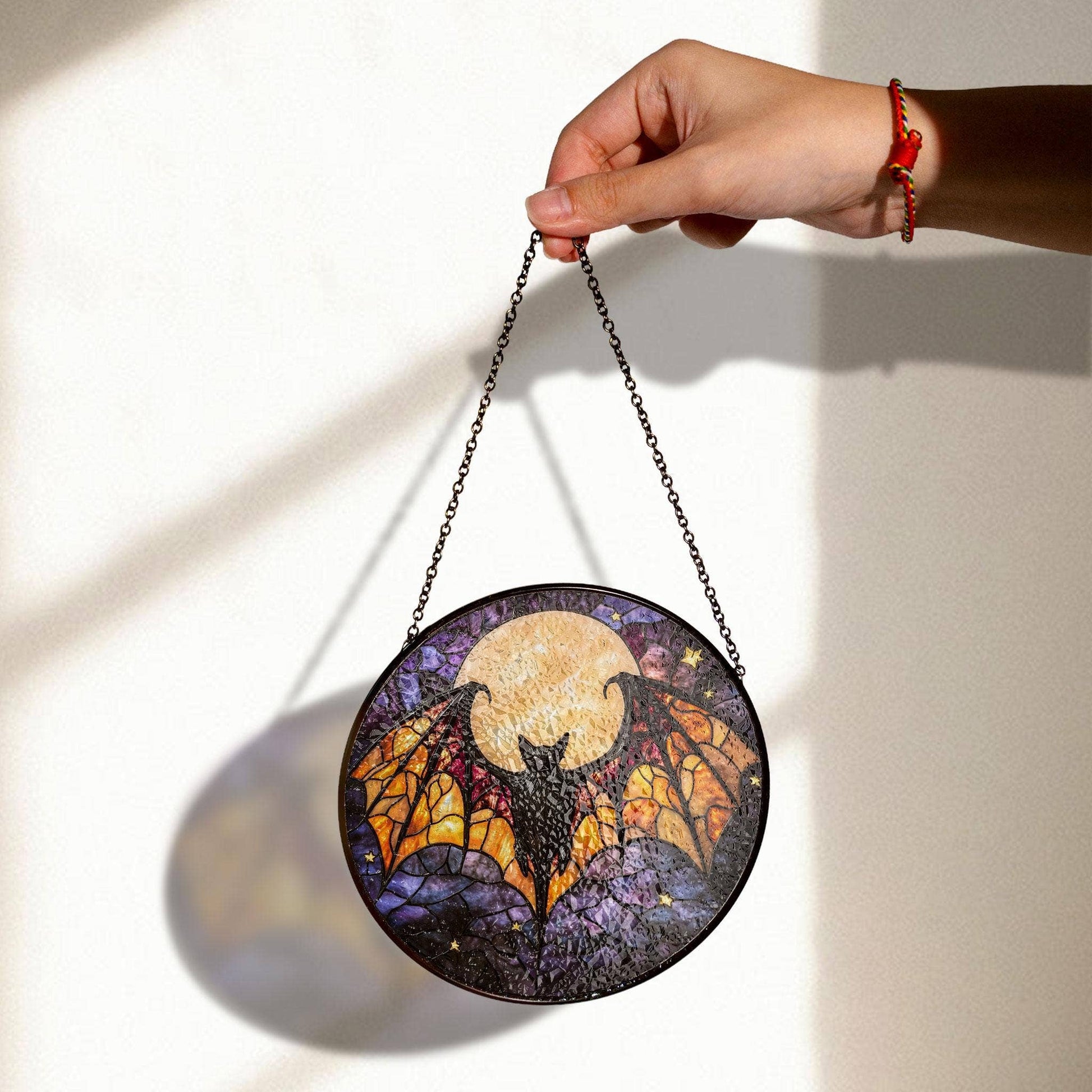 Framed with reinforced zinc edging and finished with a matte coating to keep those colors glowing longer than a vampire’s nightlife, this little cutie hangs effortlessly with the included black metal chain and suction cup. Whether it’s catching moonlight, candlelight, or your cat’s curious gaze, it’s a showstopper every time.